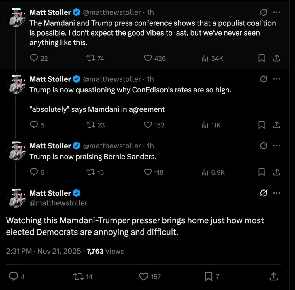 The mere idea that there can be a “bottom vs top” politics should not be allowed in serious discourse. By any reasonable understanding, this is what left vs right is. You see similar ideas to the claims a year ago that Trump 2.0 would be “anti-monopoly”—you didn’t have to wait until one family practically owns every single major media corporation to predict that this would not be true. It’s close too to Cenk Uygur’s casting of Marjorie Taylor Greene as some kind of new politics for voting to release the Epstein Emails and then resigning, ignoring the much more obvious truth that she is saving her own political career from a sinking ship that had no problem putting Epstein’s “closest friend” into the the White House, twice.