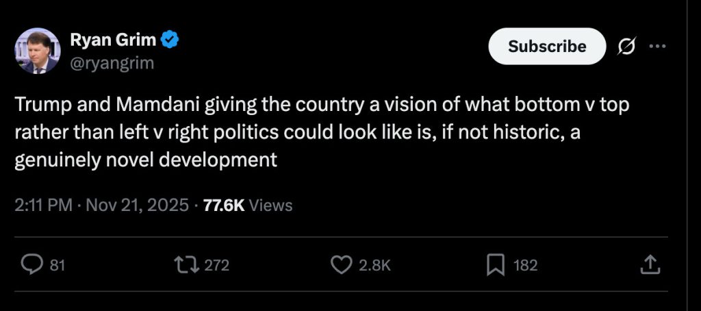 “It’s not about left vs right, it’s about ___” gets thrown around a lot in US politics, to our detriment. It is an incorrect statement that only makes things harder to understand. Take a recent analysis from longtime Intercept DC Bureau Chief and Drop Site co-founder Ryan Grim on Zohran Mamdani’s meeting with Donald Trump:
